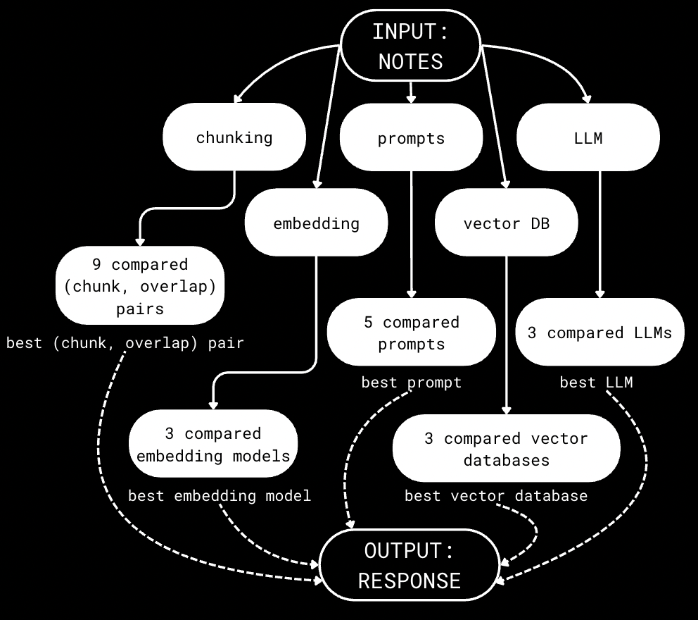 This allowed us to test a singular variable with each question and refine our optimal pipeline to a single LLM, embedding type, vector database, and system prompt. The variable testing per question was as follows: