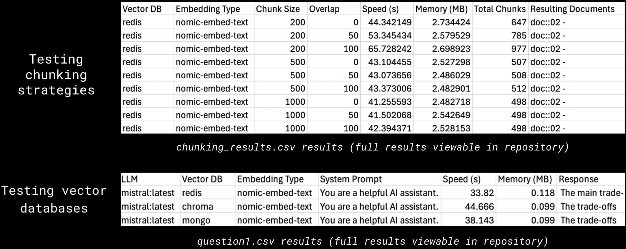 Of the variables collected in chunking_strategies.csv, only Speed (in seconds), Memory (in MB), Total Chunks and Resulting Documents would be potentially relevant in identifying the optimal chunking strategy (Vector DB and Embedding Type were held constant)