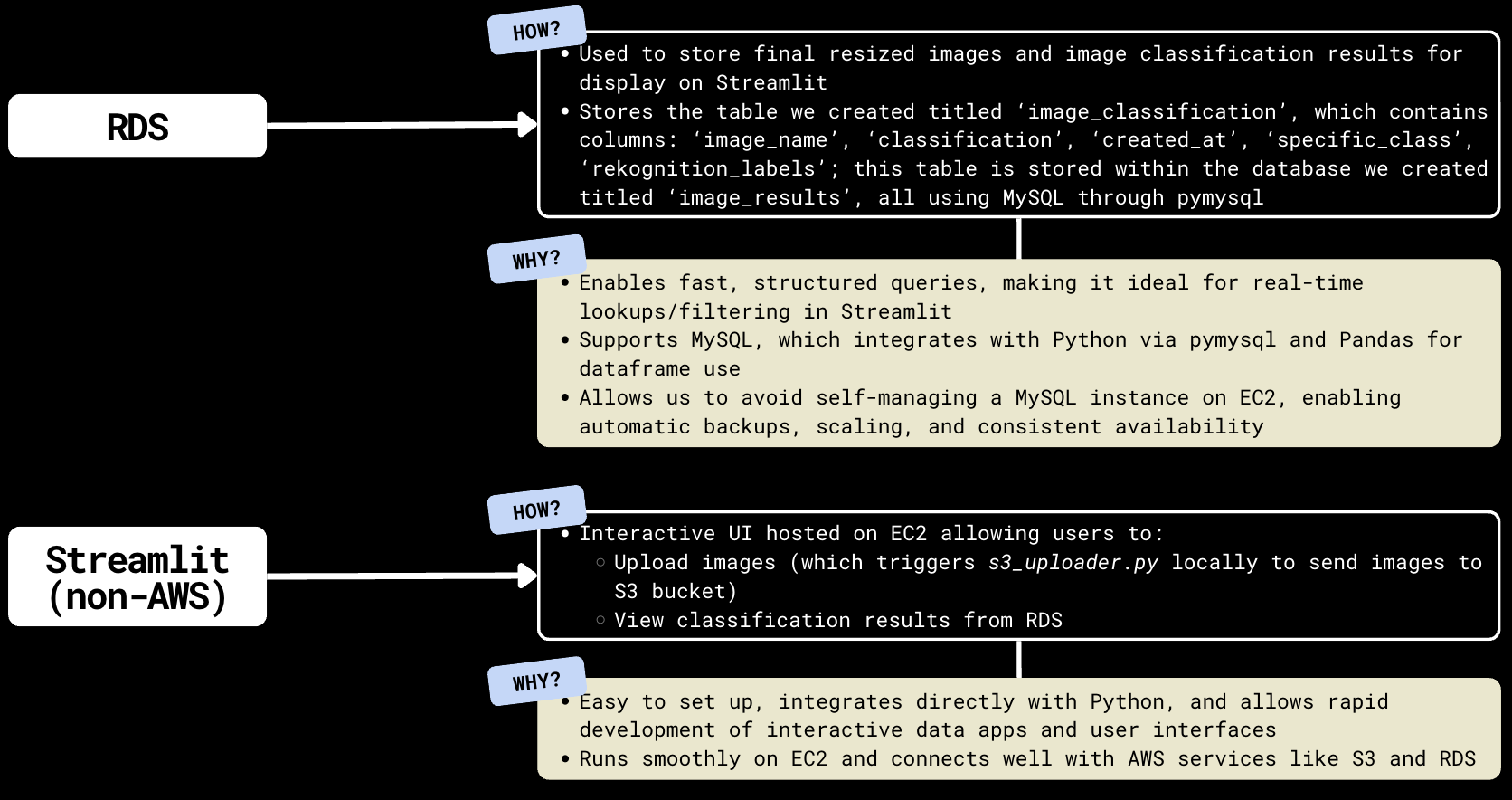 Our final Streamlit implementation includes image uploading, connection to RDS, and plotting, which we researched for the project