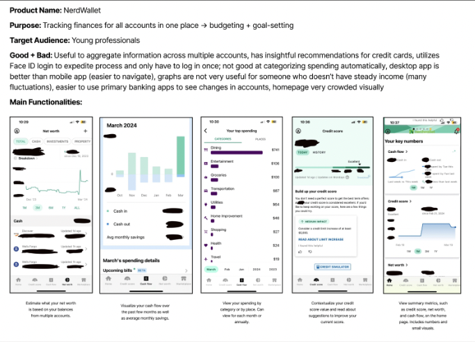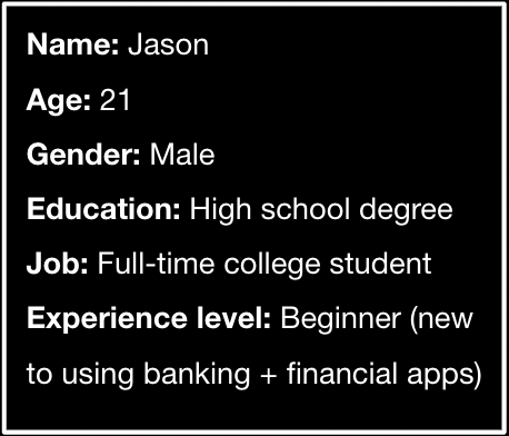 Jason is a current undergraduate student who is funding his own education. He often worries about his expenses as he was never taught how to properly budget his money, making it difficult for Jason to calculate how much he needs to be saving to pay off student loans. He has tried to use his native banking apps to monitor his financial situation, but frequently finds himself overwhelmed by the information he finds. Jason uses his banking apps about three times per week on his phone, but sometimes logs in using his desktop when planning to read articles on a topic or use many of the app’s functionalities at once. His main reasons for using his banking apps are to check his account balance, monitor spending categories, and view his credit score.
